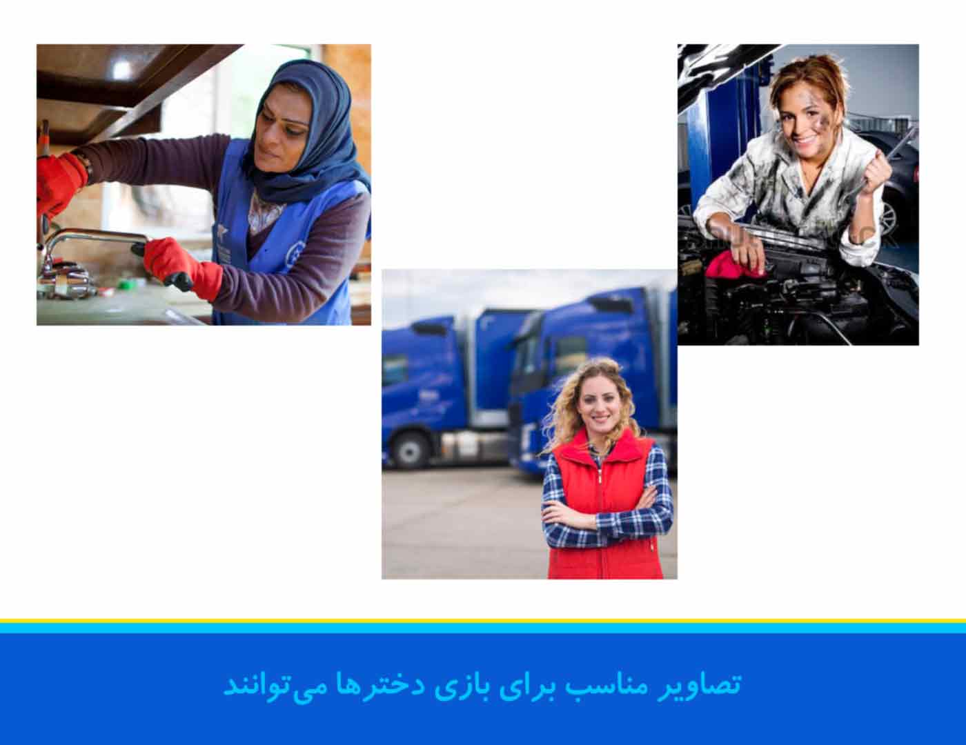 در این بازی شما به دخترتان تصاویری از دختران شاغل نشان میدهید و از او میخواهید این مشاغل را حفظ کند. سپس تصاویر را برداشته و از کودک میخواهید که اسامی مشاغل را به خاطر بسپارد. توصیه میکنیم از مشاغلی که امروز در جامعه به عنوان “مشاغل مردانه” شناخته میشوند مانند بنایی، تعمیرکاری، رانندگی ماشین آلات سنگین و غیره؛ مانند تصویر زیر استفاده کنید.