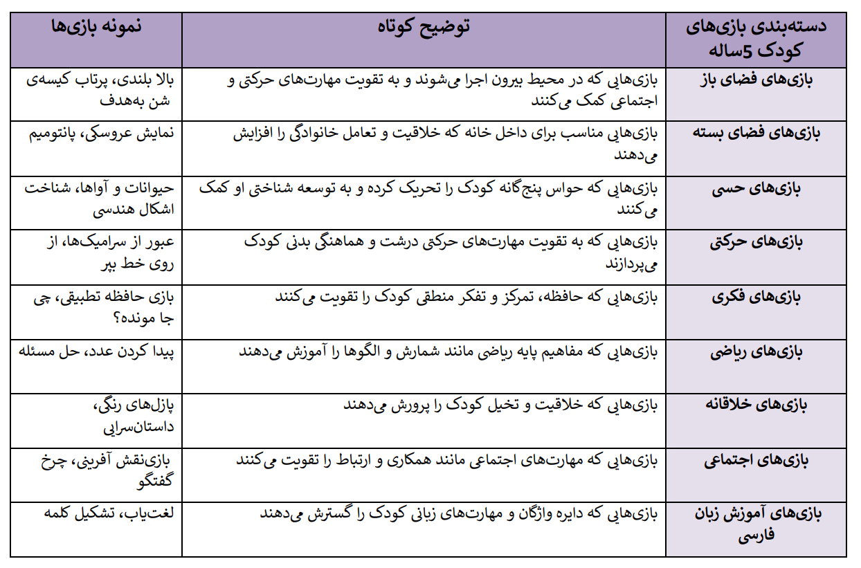 در جدول زیر مجموعه دسته بندیهایی که برای بازی با کودک 5 سالهتان میتوانید داشته باشید را اورده ایم. در ادامهی مقاله هر کدام از دستهها دقیقتر توضبح داده شدهاند و برای هر دسته مثالهای بیشتری نوشته شده است.